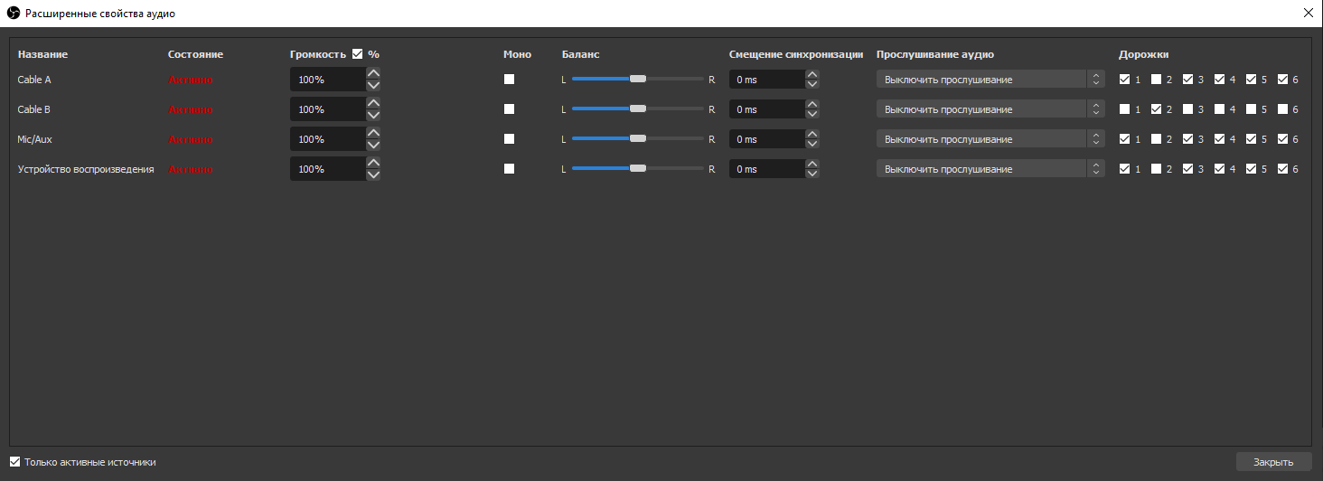 Чтобы выбрать нужные дорожки для нужных устройств в Микшере аудио нажмите правой кнопкой мыши и кликните Расширенные свойства аудио. Например, для источника Cable B оставляем только дорожку 2, а для других источников все дорожки, кроме дорожки 2.