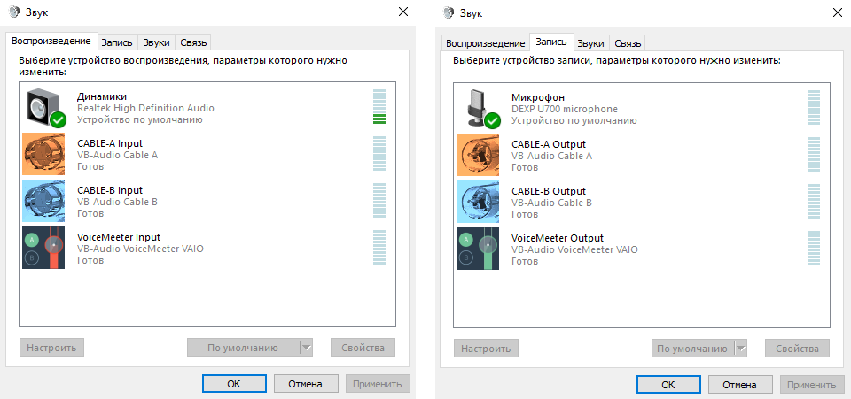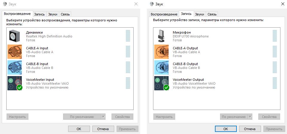В списке устройств должно получится примерно следующее, но в зависимости от ваших устройств может быть по-другому, главное чтобы устройства VB-Audio были такими: