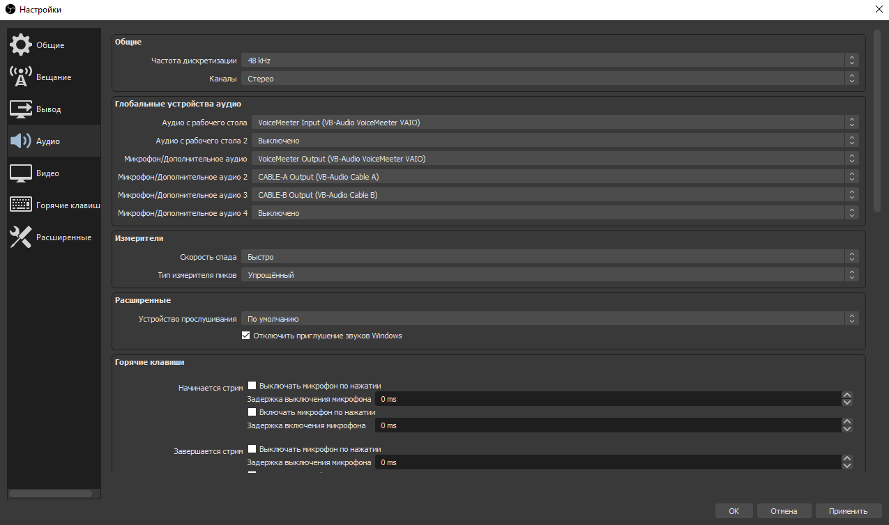 Здесь, в разделе Глобальные устройства аудио, в Аудио с рабочего стола укажем устройство VoiceMeeter Input (VB-Audio VoiceMeeter VAIO), в Микрофон/Дополнительное аудио укажем устройство VoiceMeeter Output (VB-Audio VoiceMeeter VIAO), в Микрофон/Дополнительное аудио 2 укажем CABLE-A Output (VB-Audio Cable A), в Микрофон/Дополнительное аудио 3 укажем CABLE-B Output (VB-Audio Cable B).