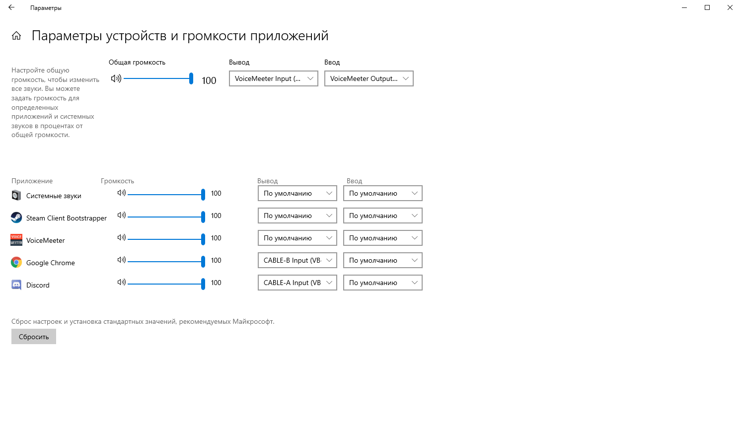 Например, для Google Chrome можно выбрать устройство CABLE-B Input (VB-Audio Cable B), а для Discord CABLE-A Input (VB-Audio Cable A).